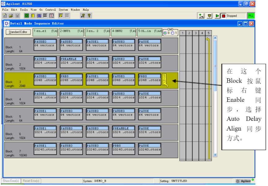 下面我們要根據(jù)GEPON測試的要求,設置每個序列的碼型,enable信號是“0”和“1”,用于開啟和關斷激光器,ONU 需要發(fā)送Burst信號,由preamble和PRBS 組成。由于有兩路ONU信號,而且它們的時序有先后,所以在編輯碼型時,需要把兩路 ONU發(fā)送 Burst信號的時間錯開。