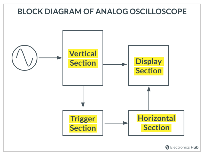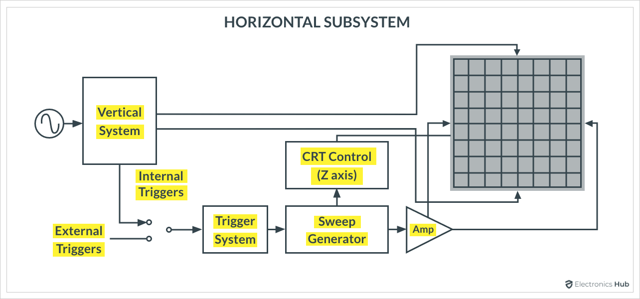 上框圖中的垂直部分負(fù)責(zé)將主圖像發(fā)送到CRT的垂直偏轉(zhuǎn)板。垂直部分放大或衰減輸入信號(hào)。水平部分負(fù)責(zé)電子束從左到右的運(yùn)動(dòng)。觸發(fā)部分確定何時(shí)在CRT上繪制波形。