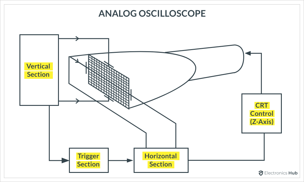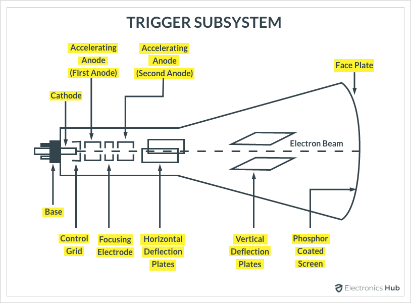 CRT 是所有模擬示波器的主要部分。如果我們能理解CRT的工作原理,那么我們就可以很容易地知道如何在CRT的屏幕上顯示波形。下圖顯示了在 CRT 上顯示波形所需的基本構(gòu)建基塊。