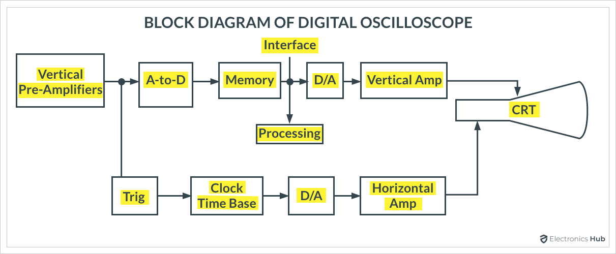 讓我們以帶有CRT的數(shù)字示波器為參考來了解其工作原理。下圖顯示了帶有 CRT 顯示屏的典型數(shù)字示波器的簡化框圖。