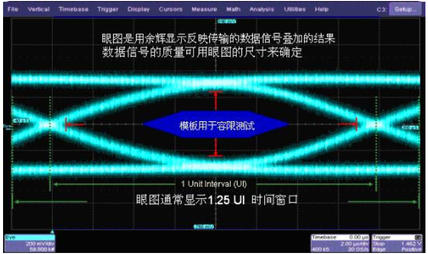 "眼圖就是象眼睛一樣形狀的圖形。”眼圖是用余輝方式累積疊加顯示采集到的串行信號的比特位的結(jié)果,疊加后的圖形形狀看起來和眼睛很像,故名眼圖。眼圖上通常顯示的是1.25UI的時間窗口。眼睛的形狀各種各樣,眼圖的形狀也各種各樣。通過眼圖的形狀特點可以快速地判斷信號的質(zhì)量。