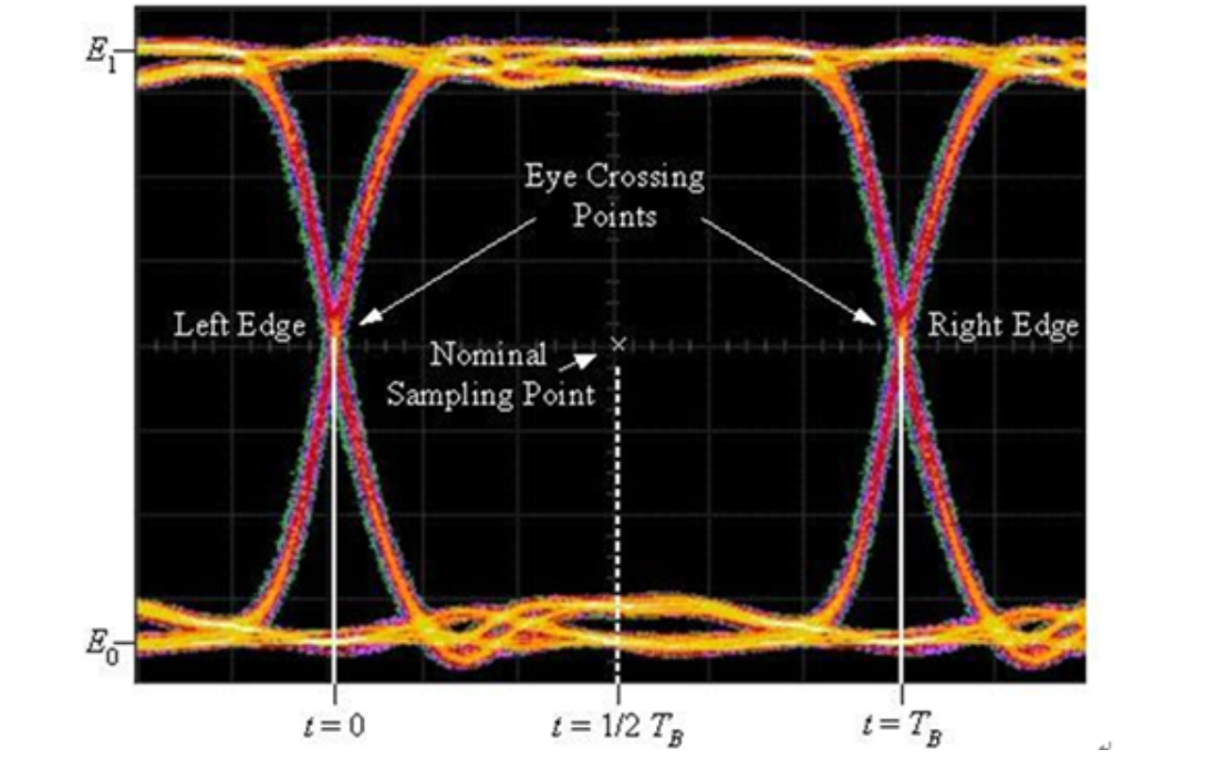 眼寬”反映信號(hào)的總抖動(dòng),即是眼圖在水平軸所開(kāi)的大小,其定義為兩上緣與下緣交匯的點(diǎn)(Crossing Point)間的時(shí)間差。
