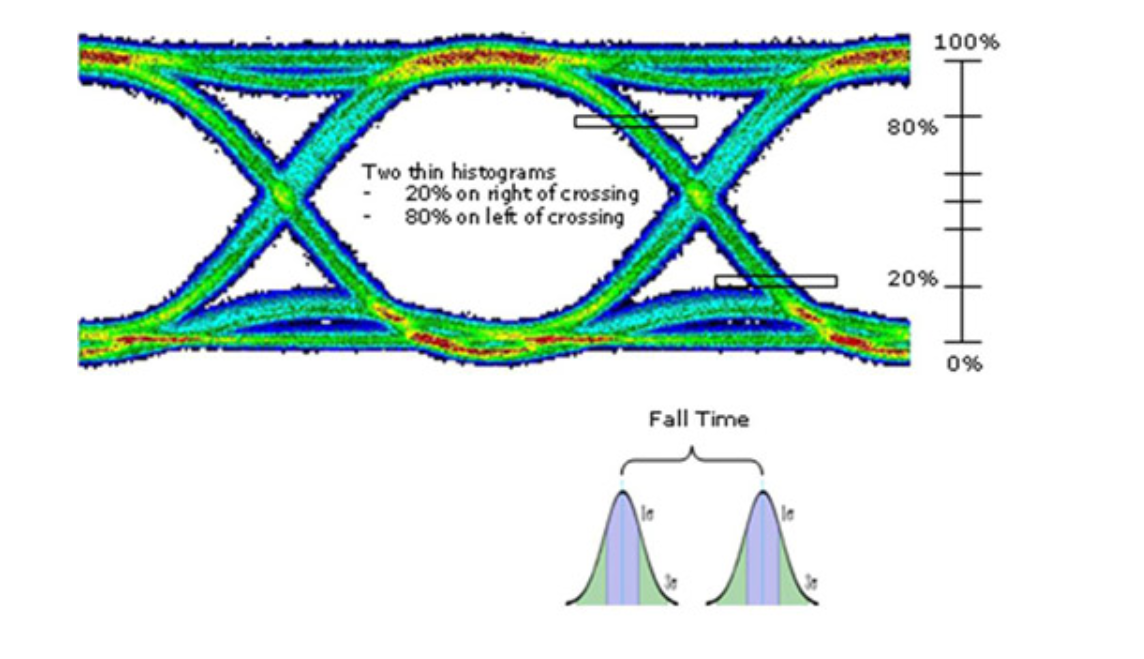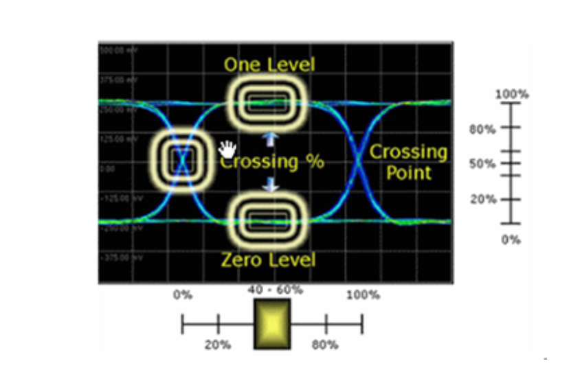 眼幅度”表示“1”電平信號(hào)分布與“0”電平信號(hào)分布平均數(shù)之差,其測(cè)量是通過(guò)在眼圖中央位置附近區(qū)域(通常為零點(diǎn)交叉時(shí)間之間距離的20%)分布振幅值進(jìn)行的。