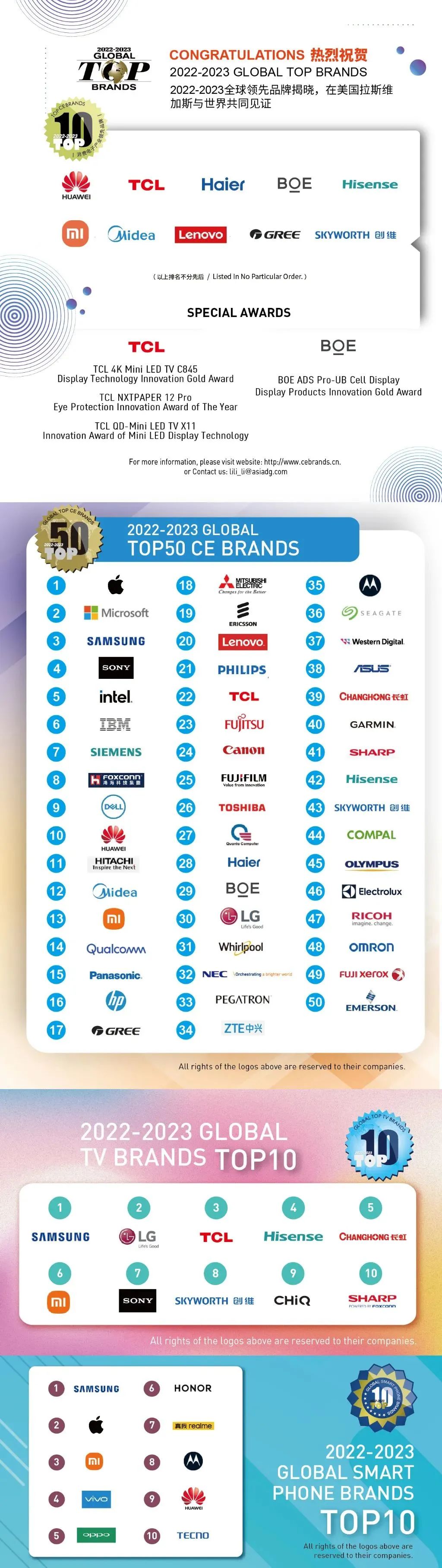 在本次發(fā)布的“全球領(lǐng)先品牌Global Top Brands”榜單中,一個(gè)個(gè)中國品牌閃耀世界。其中“2022-2023年度消費(fèi)電子領(lǐng)先品牌TOP10”榜單,被華為、TCL、海爾、京東方、海信、小米、美的、聯(lián)想、格力、創(chuàng)維,中國品牌壟斷。