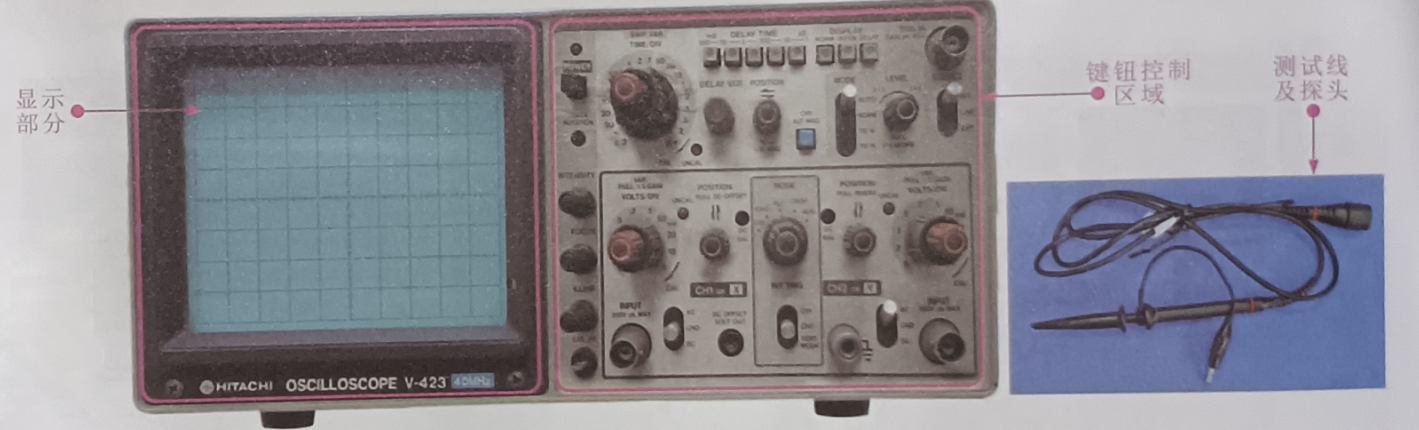 如圖所示,典型模擬示波器的整機結(jié)構(gòu)。主要由顯示部分、鍵鈕控制區(qū)域、測試線及探頭、外殼等部分構(gòu)成。