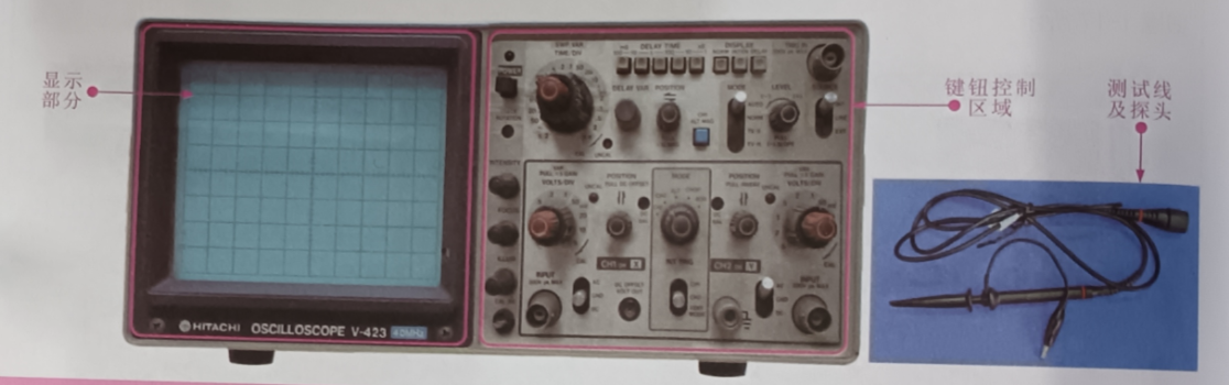 如圖所示,典型模擬示波器的整機(jī)結(jié)構(gòu)。主要由顯示部分、鍵鈕控制區(qū)域、測(cè)試線及探頭、外殼等部分構(gòu)成。