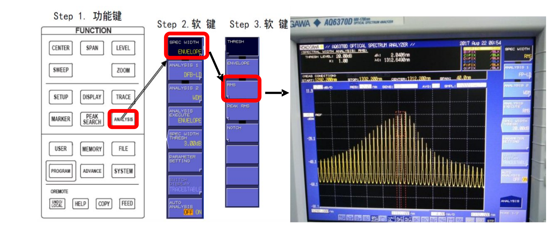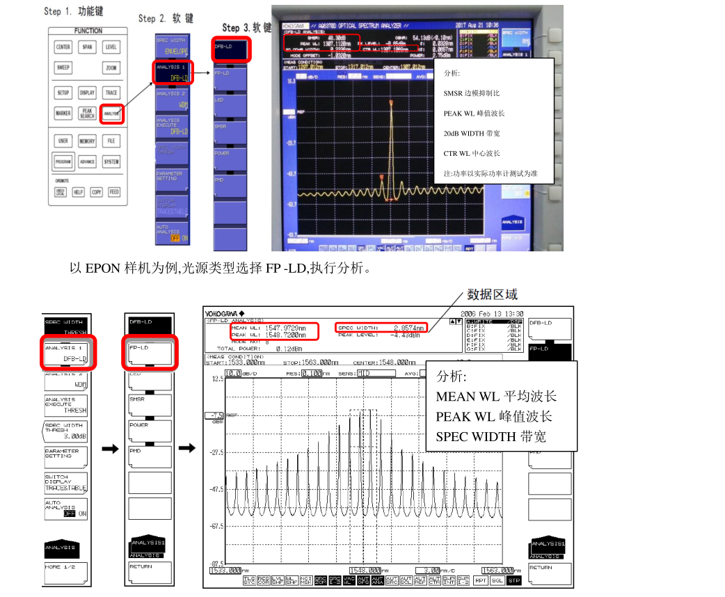注意:在分析 FP-LD 光源時,數(shù)據(jù)區(qū)域內(nèi) SPEC WIDTH 測試得就是 3dB 帶寬,與 K 系數(shù)有關(guān),當(dāng) K=1 時,SPEC