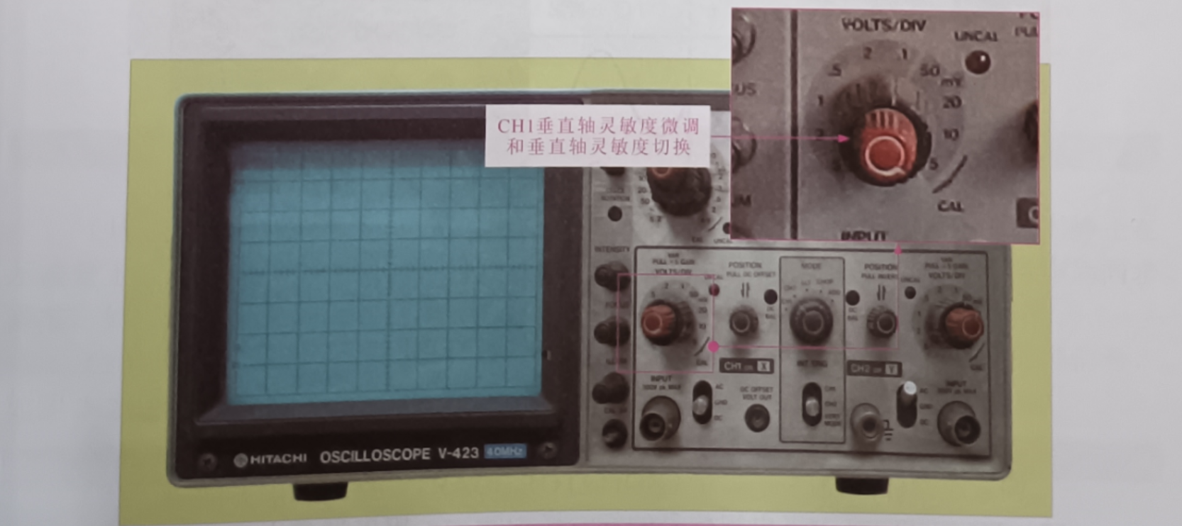 CH1 垂直軸靈敏度微調(diào) (VARIABLE) 和垂直軸靈敏度切換 (VOLTSDIV): 這兩個(gè)旋鈕是一個(gè)同心調(diào)整旋鈕,外圓環(huán)形旋鈕是靈敏度切換鈕,內(nèi)圓旋鈕是微調(diào)鈕,可以根據(jù)被測(cè)信號(hào)的幅度切換輸入電路的衰減量,使顯示的波形在示波管上有適當(dāng)?shù)拇笮。鐖D所示。