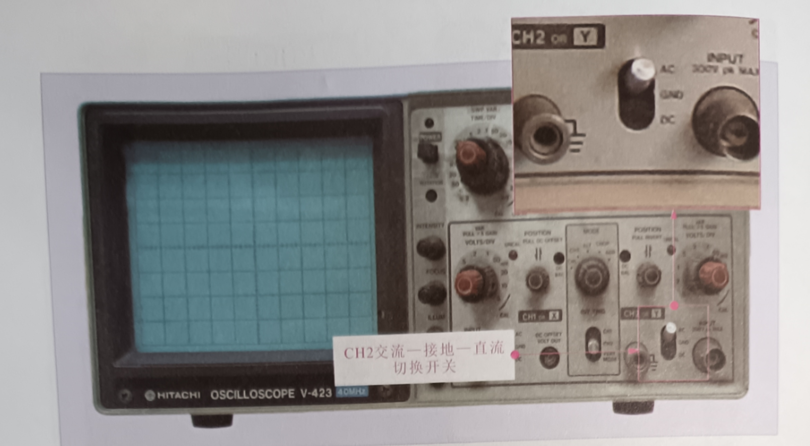 CH2 交流一接地一直流切換開關(guān)[(CH-2)AC-GND-DC]: 根據(jù) CH2 信號(hào)輸入端輸入的信號(hào)選擇不同的擋位,AC 為觀測(cè)交流信號(hào),DC 為觀測(cè)直流信號(hào),GND 為觀測(cè)接地,如圖所示