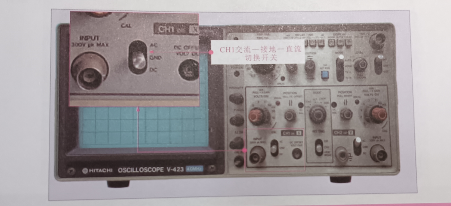 CH1 交流一接地一直流切換開關(guān)[(CH-I)AC-GND-DC]: 根據(jù) CH1 信號(hào)輸入端輸入的信號(hào)選擇不同的擋位,AC 為觀測(cè)交流信號(hào),DC 為觀測(cè)直流信號(hào),GND 為觀測(cè)接地,如圖所示。