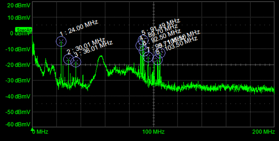 在查看RF干擾頻譜時,我們通??梢允叭√囟ǖ耐ㄐ判盘枴D5顯示了使用帶有大尖端環(huán)路的10倍探頭測量的USB供電設備中電源軌的實時頻譜。頻譜指紋顯示從87 MHz到108 MHz的FM無線電頻段的拾音。