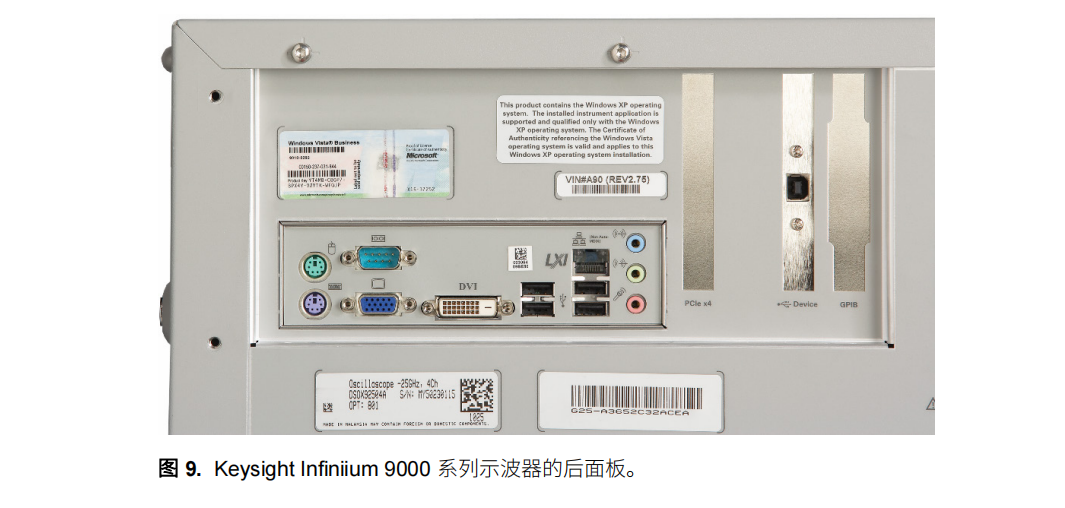 您可以通過通道輸入端將信號(hào)發(fā)送到示波器,通道輸入端就是用于插入探頭的連接器。 顯示屏就是顯示這些 信號(hào)的屏幕。 水平控件和垂直控件包括旋鈕和按鈕,用于控制屏幕顯示信號(hào)的水平軸(通常表示時(shí)間)和垂 直軸(表示電壓)。 觸發(fā)控制區(qū)則讓您可以告訴示波器,您希望時(shí)基在什么條件下開始采集。 示波器的后面板如圖 9 所示。 如您所見,許多示波器都具有與個(gè)人計(jì)算機(jī)上一樣的連接功能。 例如 CD-ROM 驅(qū)動(dòng)器、CD-RW 驅(qū)動(dòng)器、 DVD-RW 驅(qū)動(dòng)器、USB 端口、串行端口以及外部監(jiān)視器、鼠標(biāo)和鍵盤輸入。