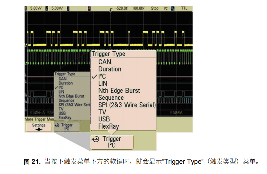 軟鍵常出現(xiàn)在未安裝 Windows 操作系統(tǒng)的示波器上(軟鍵圖片見(jiàn)圖 8)。 使用這些軟鍵可以導(dǎo)航示波器顯 示屏上的菜單系統(tǒng)。 圖 21 顯示了按下軟鍵時(shí)下拉菜單的樣子。 圖中顯示的是用于選擇觸發(fā)模式的菜單。 您可以連續(xù)按軟鍵進(jìn)行滾動(dòng)選擇,前面板上的有一個(gè)旋鈕,也用于滾動(dòng)選擇。 圖 21. 當(dāng)按下觸發(fā)菜單下方的軟鍵時(shí),就會(huì)顯示“Trigger Type”(觸發(fā)類型)菜單。