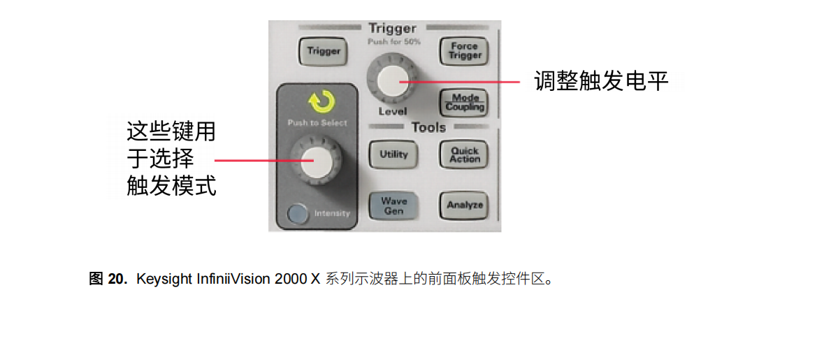 當(dāng)您需要找出特定的脈寬時(shí),脈寬觸發(fā)與毛刺觸發(fā)功能相似。 不過(guò),通常您可以觸發(fā)任何指定寬度的脈 沖,并且可以選擇要觸發(fā)的脈沖的極性(負(fù)或正)。 您還可以設(shè)置觸發(fā)的水平位置。 這樣一來(lái),您就可以 看清觸發(fā)前后的情況。 例如,您可以執(zhí)行毛刺觸發(fā),找出錯(cuò)誤,然后查看觸發(fā)前的信號(hào),以確定產(chǎn)生毛刺 的原因。 如果您將水平延遲設(shè)置為零,則觸發(fā)事件將被放在屏幕水平方向的中間位置。 在觸發(fā)之前發(fā)生的 事件將位于屏幕左側(cè),而在觸發(fā)之后發(fā)生的事件則位于屏幕右側(cè)。 您還可以設(shè)置觸發(fā)耦合,并設(shè)置想要觸 發(fā)的輸入源。 您不是必須要觸發(fā)自己的信號(hào),還可以觸發(fā)相關(guān)信號(hào)。 圖 20 顯示了示波器前面板的觸發(fā)控 件區(qū)。