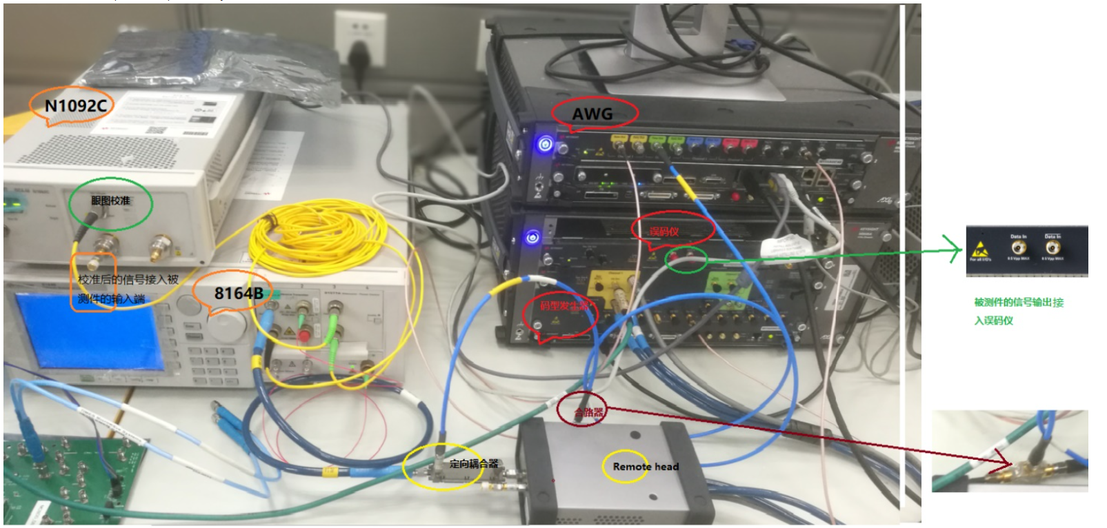這里用到的相關(guān)設(shè)備有:AXIe主機(jī)M9502A+M8195A AWG模塊+M9537A內(nèi)置PC控制器,M9505A主機(jī)+M8046A高性能誤碼儀+M8045A碼型發(fā)生器,Remote Head M8057A,DCA-M N1092C,8164B光波主機(jī)系統(tǒng),里面集成了光源如81608A+81942A參考接收機(jī)+81577A衰減器。還有一些小的部件,如合路器,定向耦合器,光纖若干,轉(zhuǎn)接頭若干。