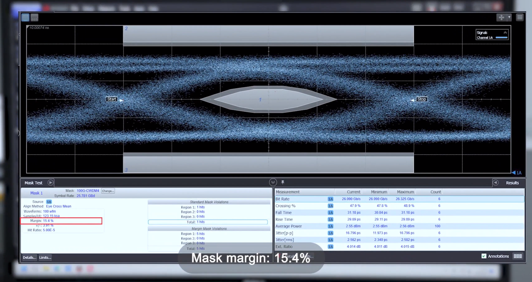 ? 測(cè)量眼圖的消光比和信噪比,分別表示信號(hào)的對(duì)比度和清晰度,反映了信號(hào)的強(qiáng)度和質(zhì)量特征。