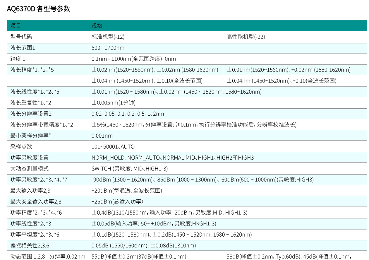 AQ6370D光譜分析儀的具體技術(shù)規(guī)格包括: