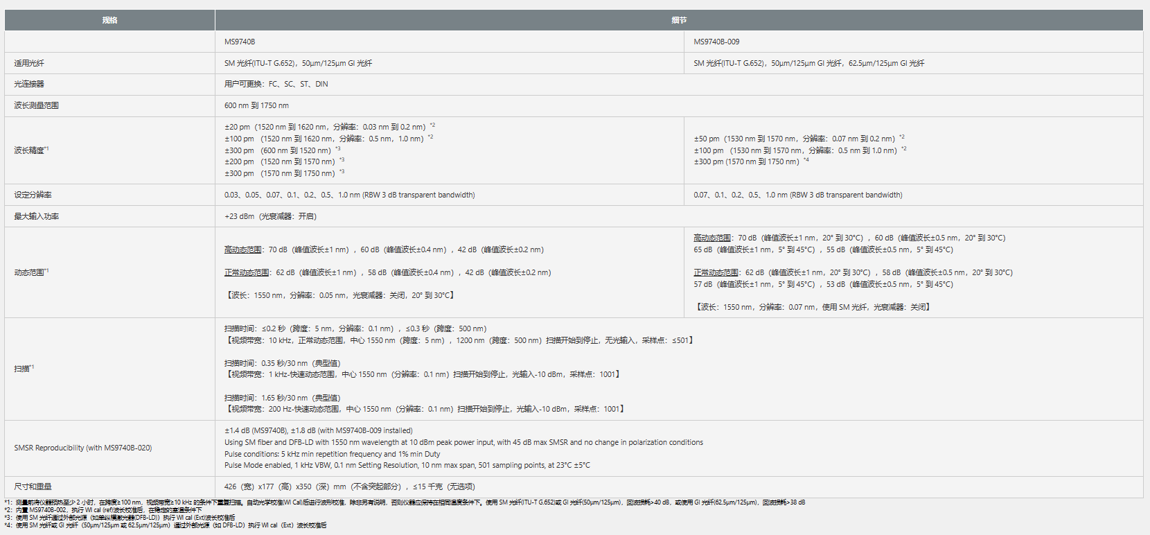 分辨率:MS9740B的分辨率為0.05nm,在1550nm波長下,且在光衰減關閉(Att: Off)的情況下,在20~30℃的溫度條件下測量得到。這一分辨率的提高意味著MS9740B能夠更精確地測量光譜中的細微差異,對于需要高精度測量的應用場景尤為重要。