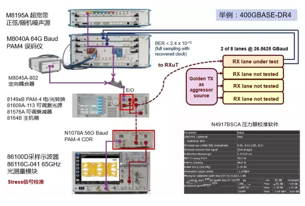 測試環(huán)境:參考的PAM4信號源與抖動、噪聲、碼間干擾注入源,以及參考的光發(fā)射機(jī)產(chǎn)生所需的光壓力信號。
