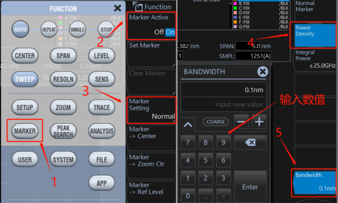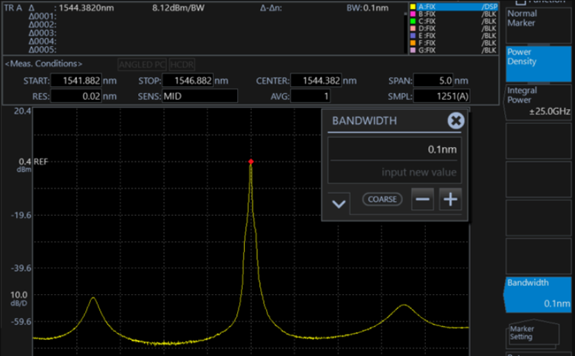 功率譜密度標(biāo)記是以波形上的標(biāo)記位置為中心,把每個在0.1nm ~ 10.0nm歸一化帶寬設(shè)置范圍內(nèi)的功率值顯示到數(shù)據(jù)區(qū)域的一項功能。測量信號噪聲功率的情況下,使用者便可采用這些標(biāo)記計算出每個既定帶寬所對應(yīng)的功率值。