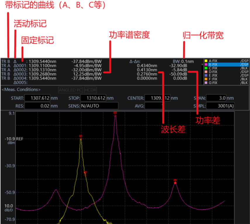 ▲光譜儀同時在多條曲線上設(shè)置多個功率譜密度標(biāo)記的示意圖