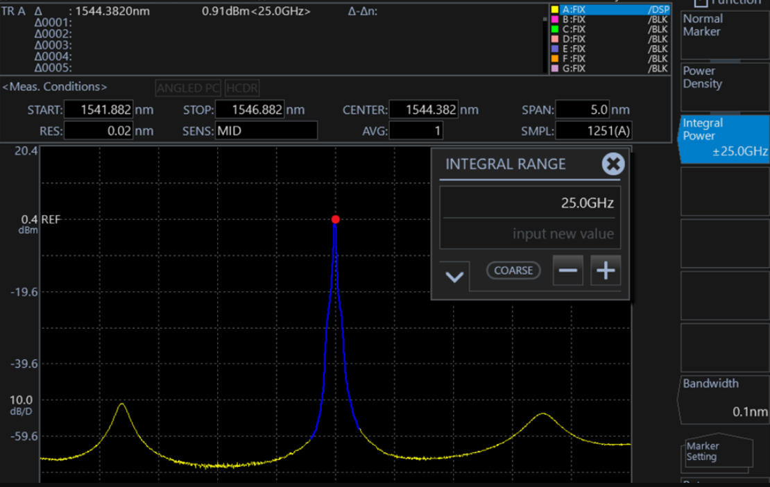 積分功率標(biāo)記是以波形上的標(biāo)記位置為中心,把指定頻率范圍的積分功率值顯示到數(shù)據(jù)區(qū)域的一項功能。在使用者調(diào)制光的光譜計算信號功率的情況下,可用此功能計算擴散光譜的積分功率。
