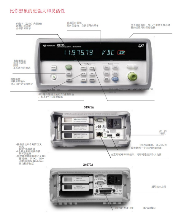 34970A提供傳統(tǒng)的GPIB和RS-232接口,34972A內置千兆位LAN和USB 2.0,因此你可以連接到現代PC上,而不必再去購買其他設備。