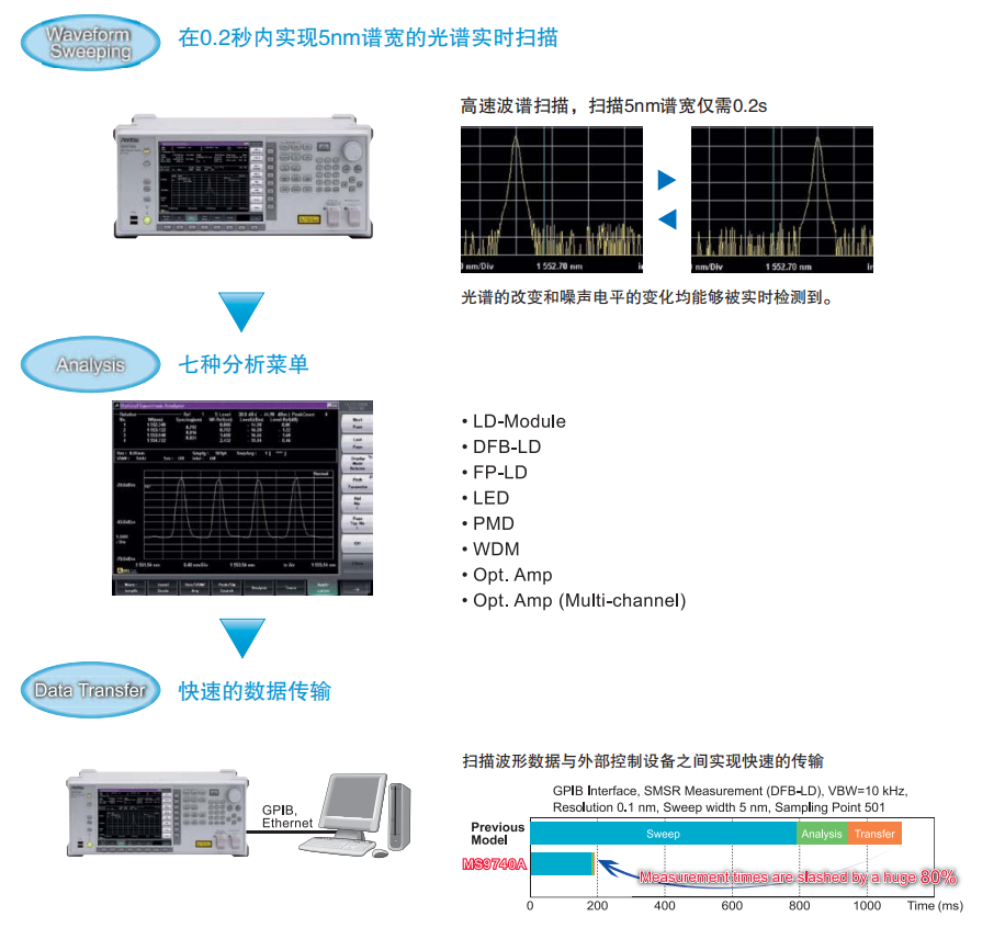 Anritsu MS9740A減少了從波形掃描到數(shù)據(jù)傳輸?shù)酵獠靠刂圃O(shè)備的總時間,并支持簡單的分析程序。流程,提供出色的性價比和更好的生產(chǎn)力