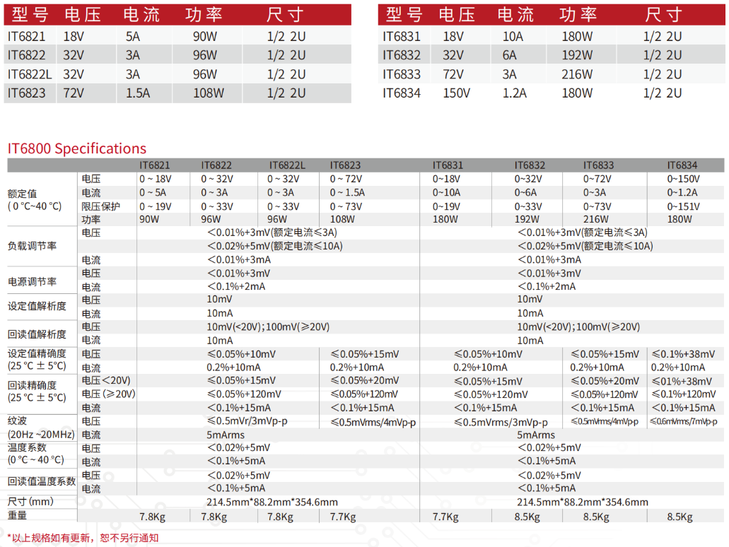 IT6800系列可編程電源(18V`150V/90W-216W)擁有小體積,大功率輸出,具有10mV,10mA的分辨率,支持RS232/GPIB/USB通訊接口。